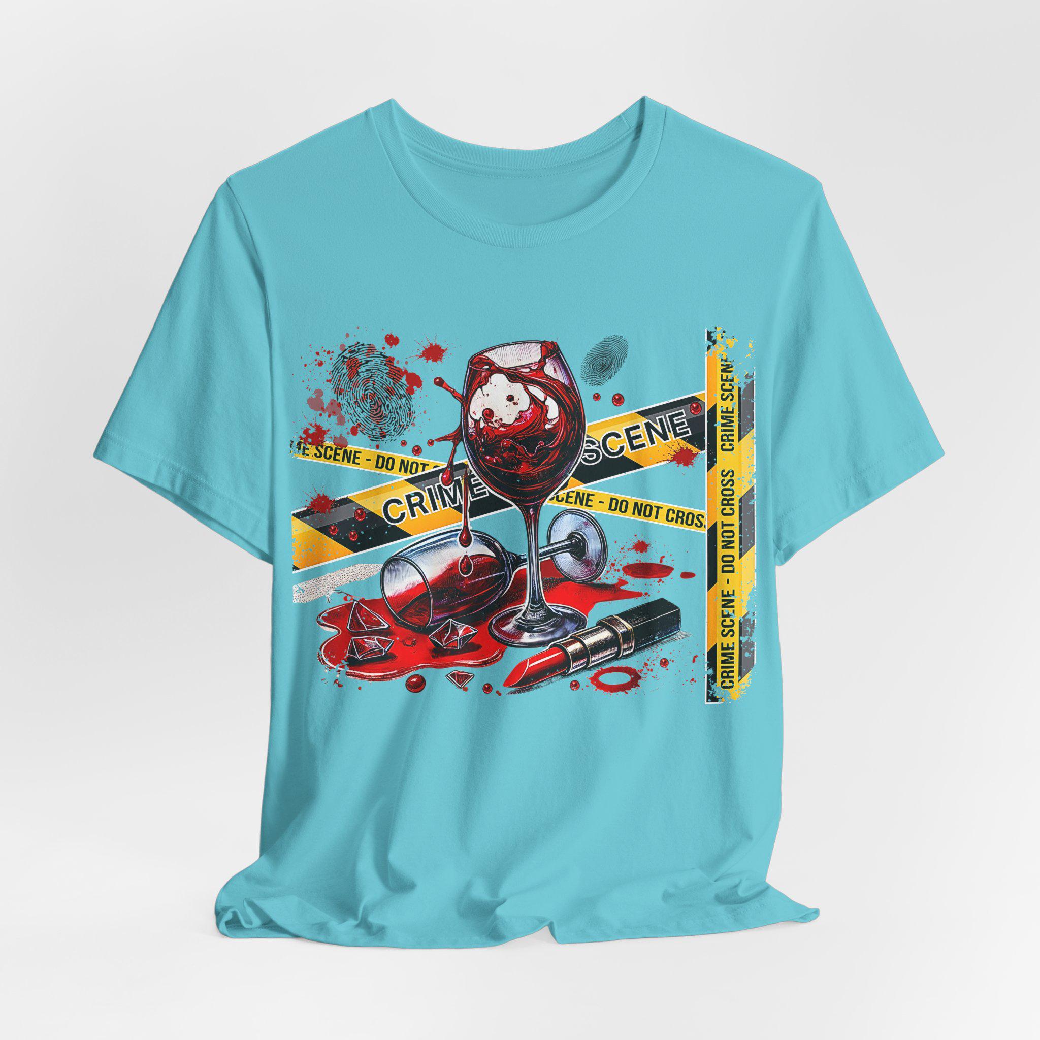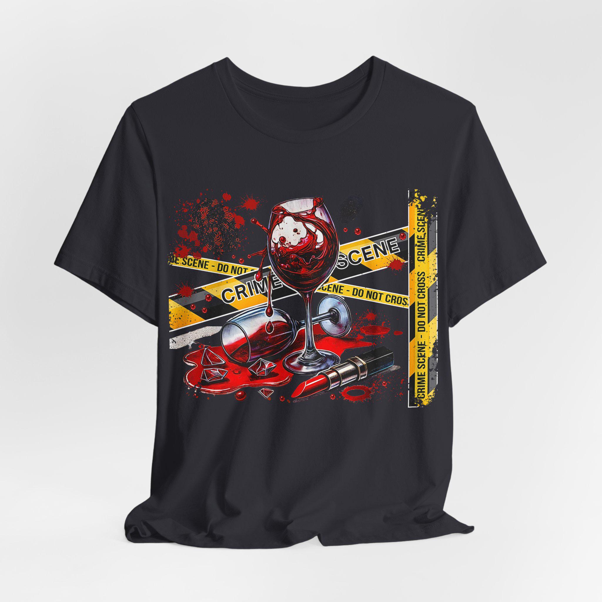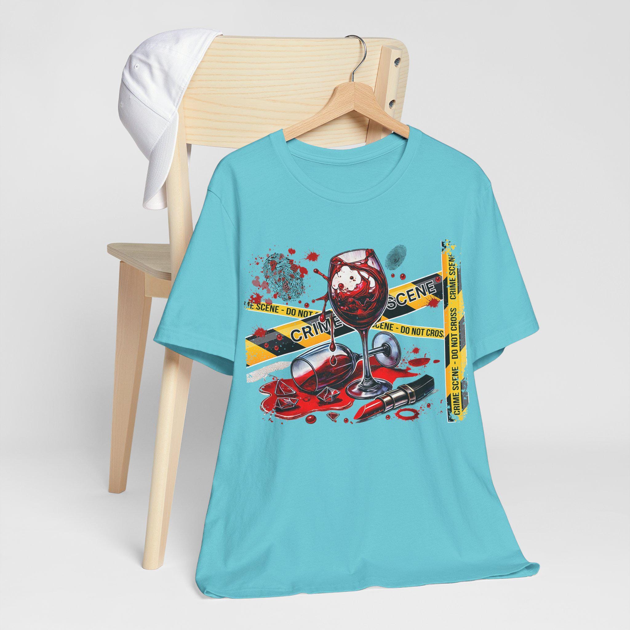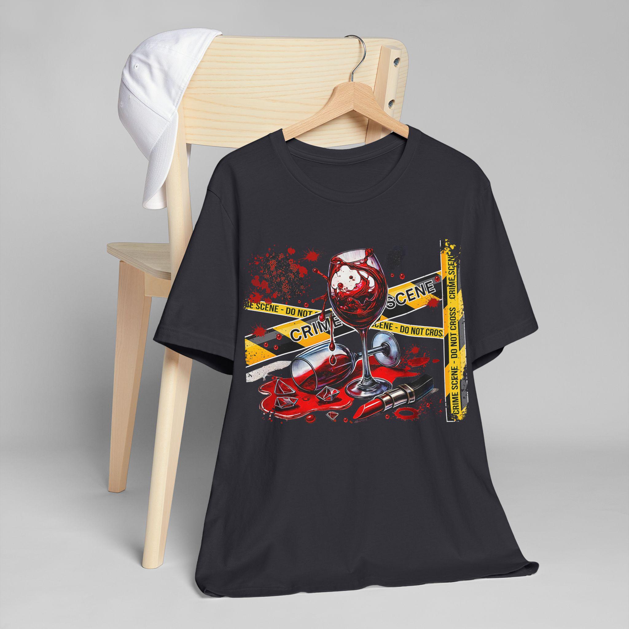 Crime Scene Wine Glass T-Shirt | Broken Glass, Blood Splatter, Caution Tape
