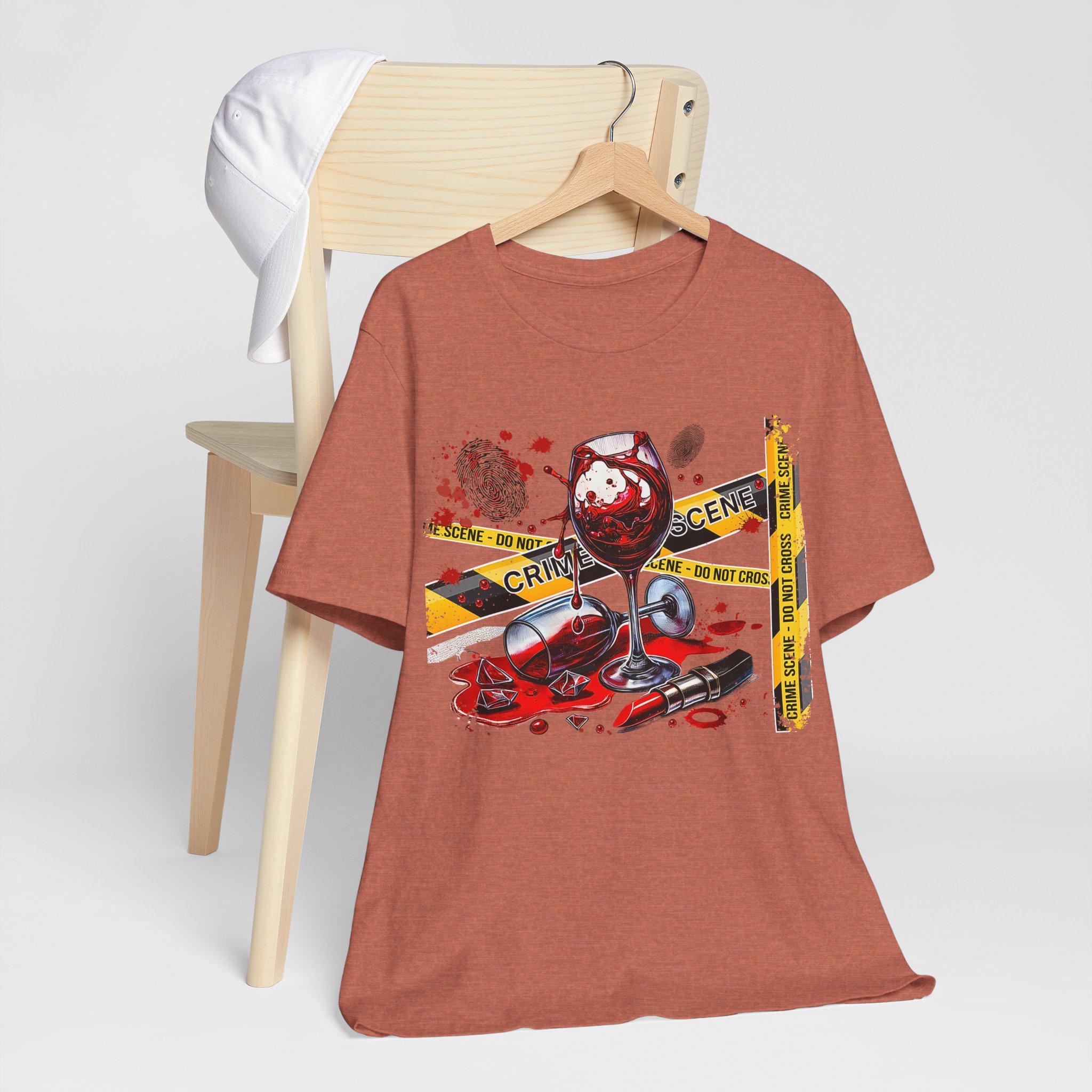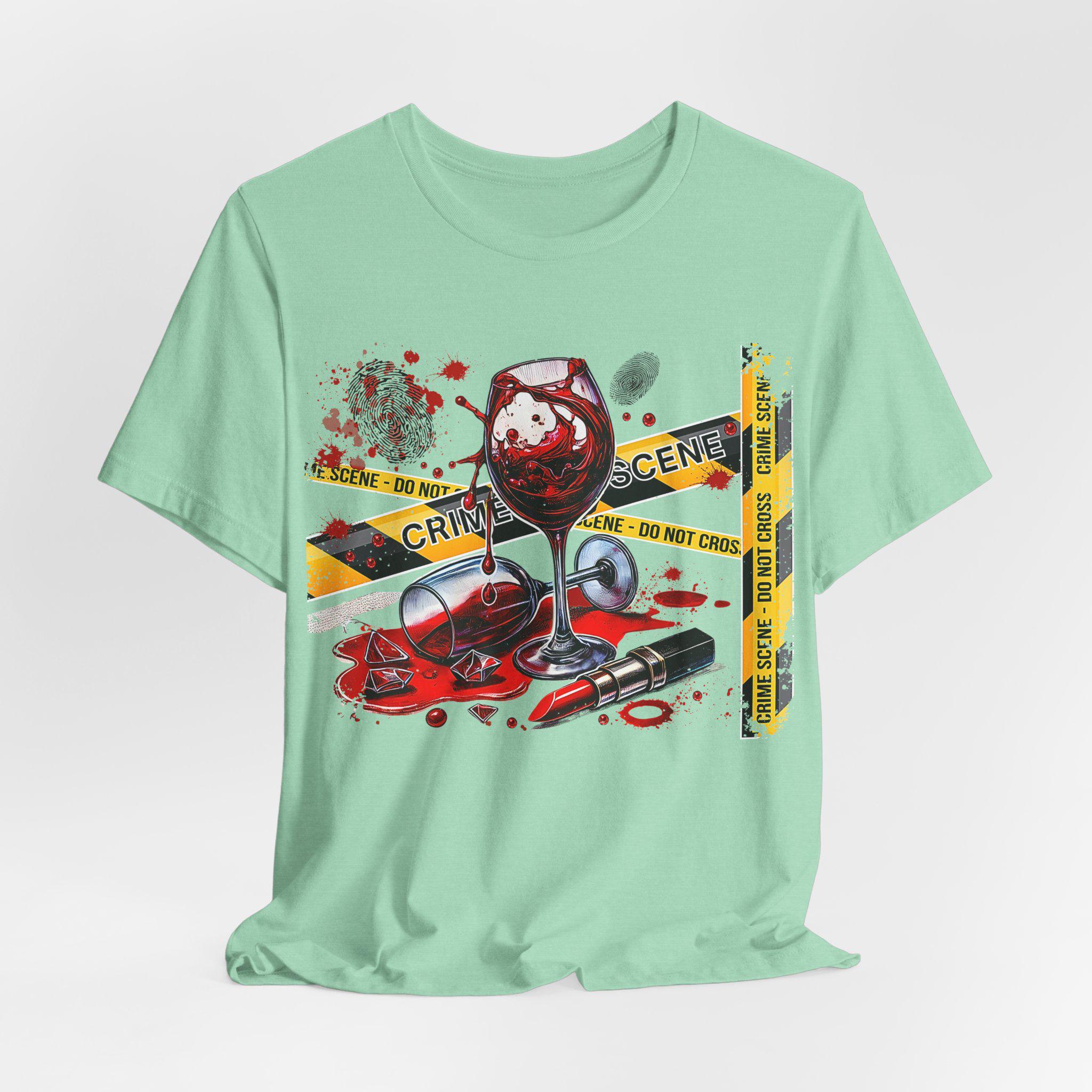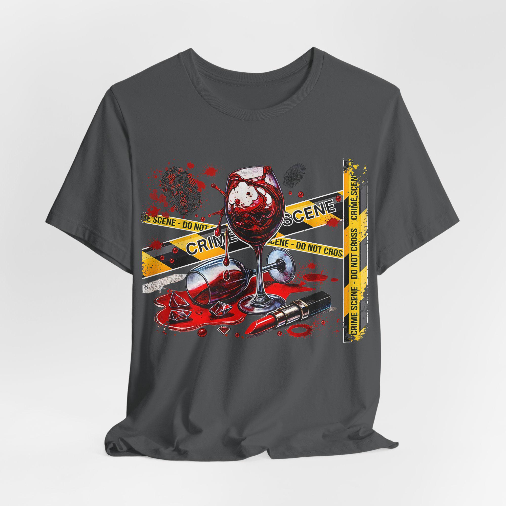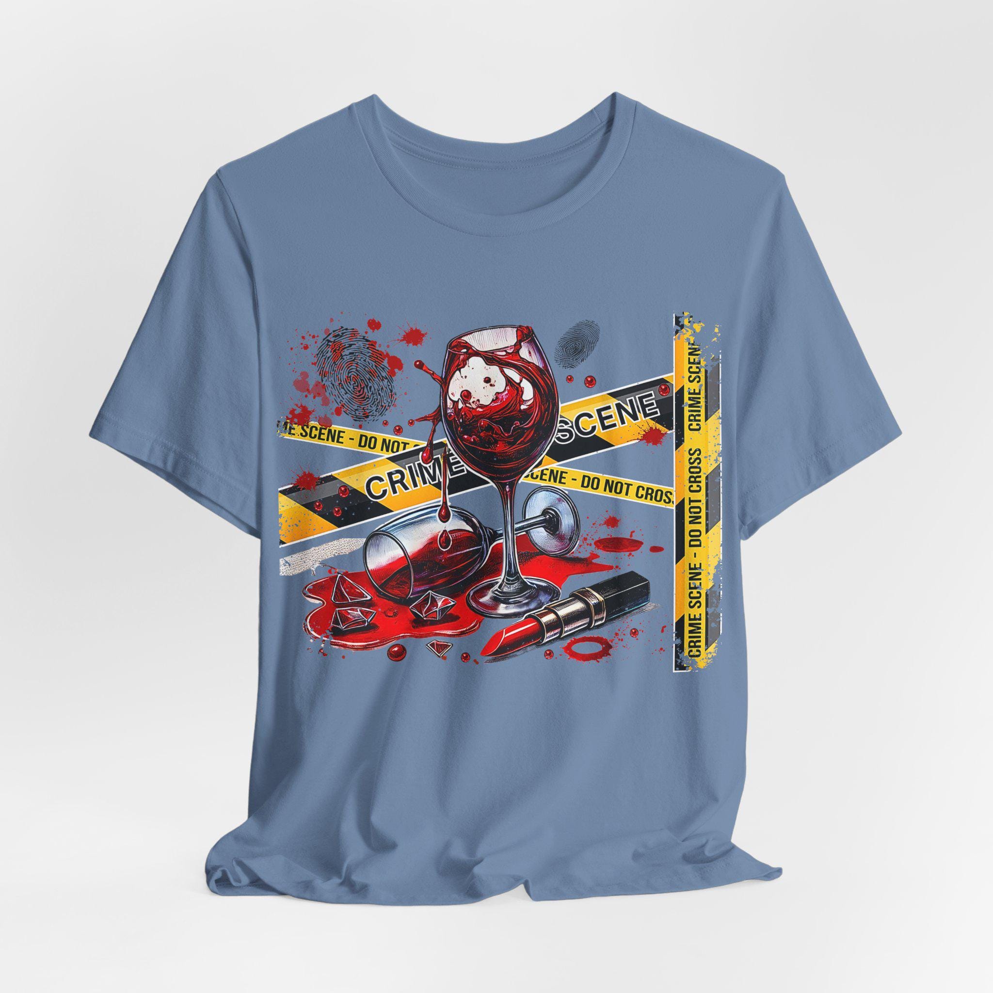Crime Scene Wine Glass T-Shirt | Broken Glass, Blood Splatter, Caution Tape